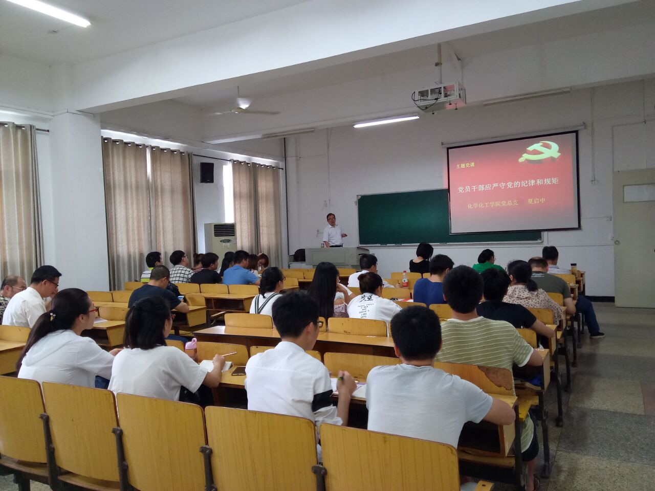 2018年6月14日下午,公司全体教职工、全体员工党员在博学楼102开展主题党日集中学习活动,总支书记夏启中同志为大家讲了题为《党员干部应严守党的纪律和规矩》的党课,并带领大家学习了5月2日习近平总书记在北大座谈会上的讲话。