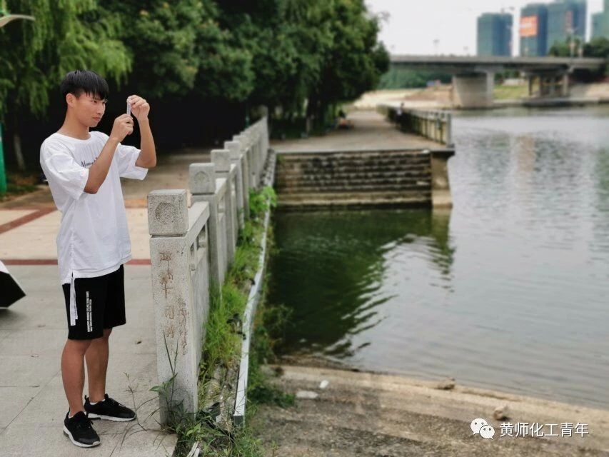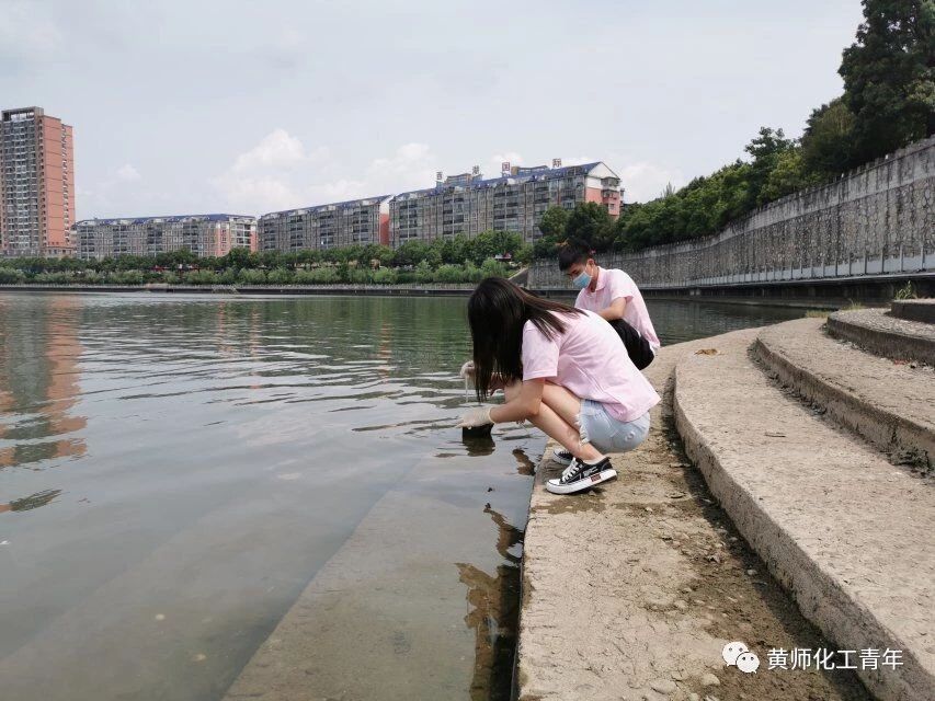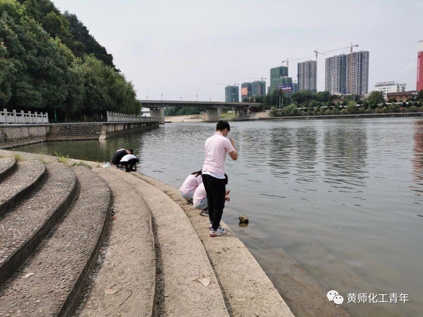 下午,团队成员前往赤壁外滩采集水样,在夏日炎炎之下,成员们耐着高温,收集此处的水源。