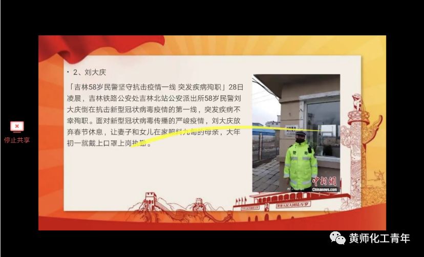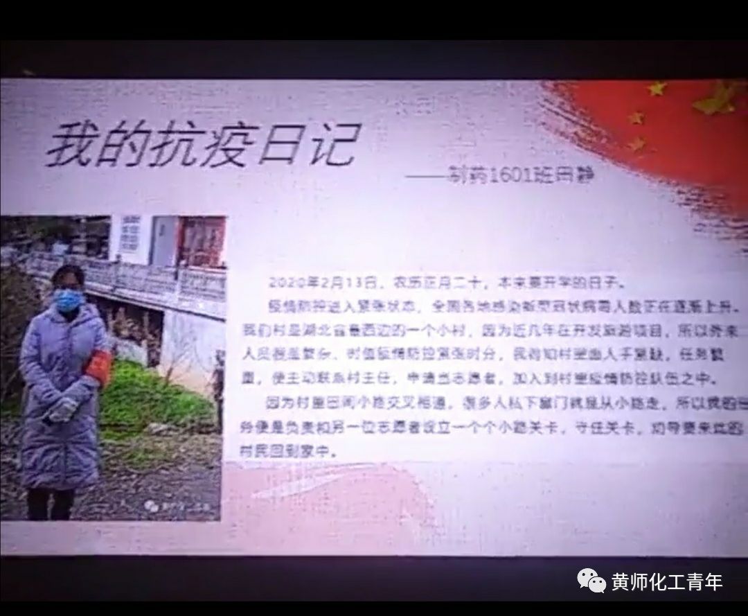 应化1902班的团支书向大家介绍了制药工程1601班田静学姐的抗疫日记。她在日记中说到自己在村里做志愿者,这表现了黄师人的责任心和无私奉献的伟大精神。