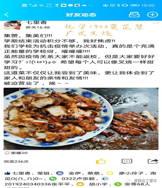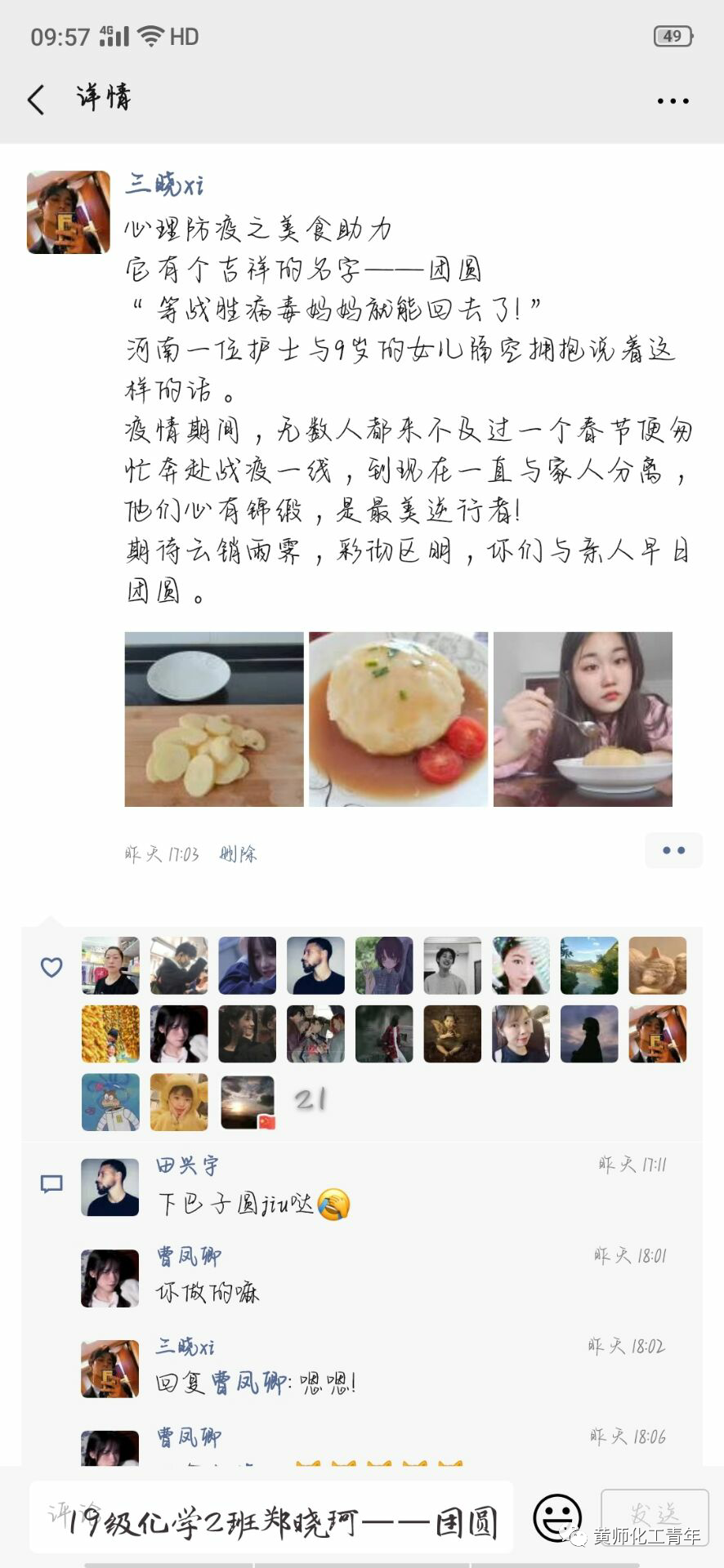 2020年4月1日星期三上午8点,由公司员工会心理部开展的“心理防疫之美食篇”活动正式开始。由于突如其来的疫情,同学们不能外出,但是“宅”在家的同时,大家也开始不断磨练自己的厨艺,让我们既欣赏了色香味俱全的美食,还见识了化工青年的多才多艺,也让我们知道,其实在家不仅可以做些事来不断提升自己,还可以缓解我们灰色焦虑的情绪。