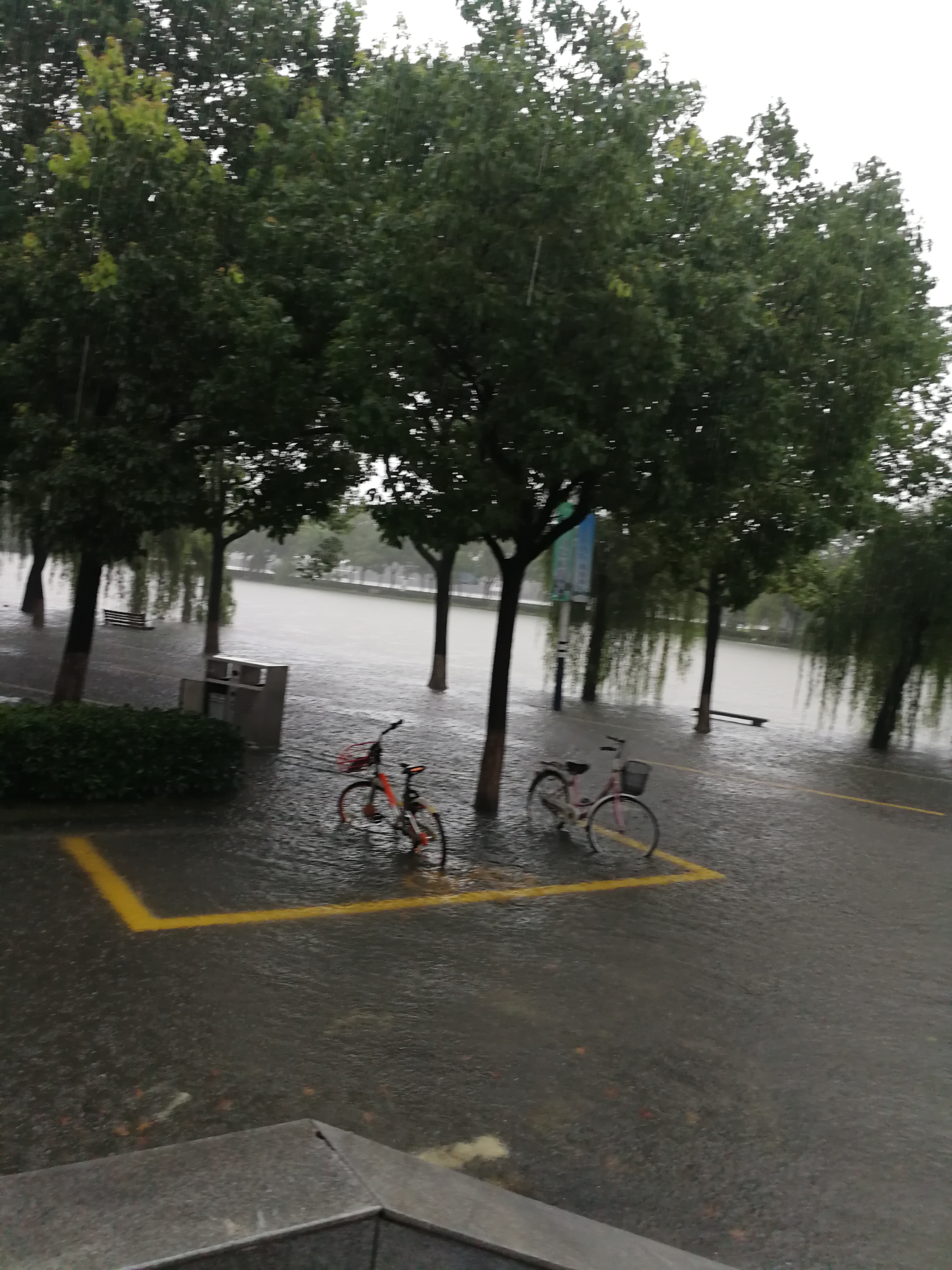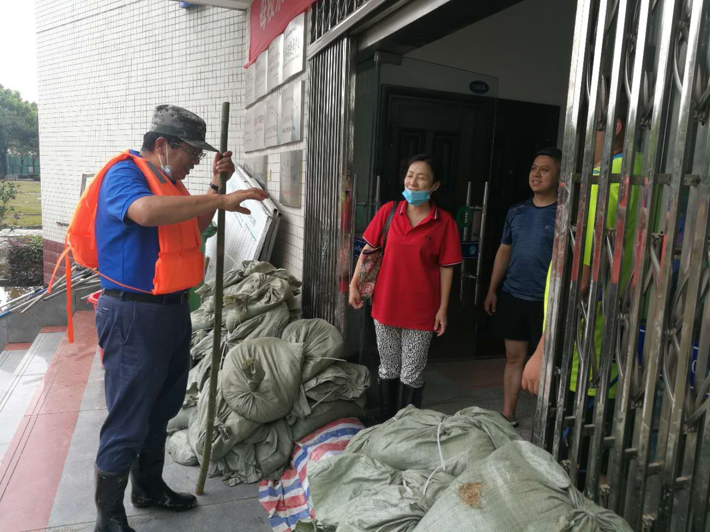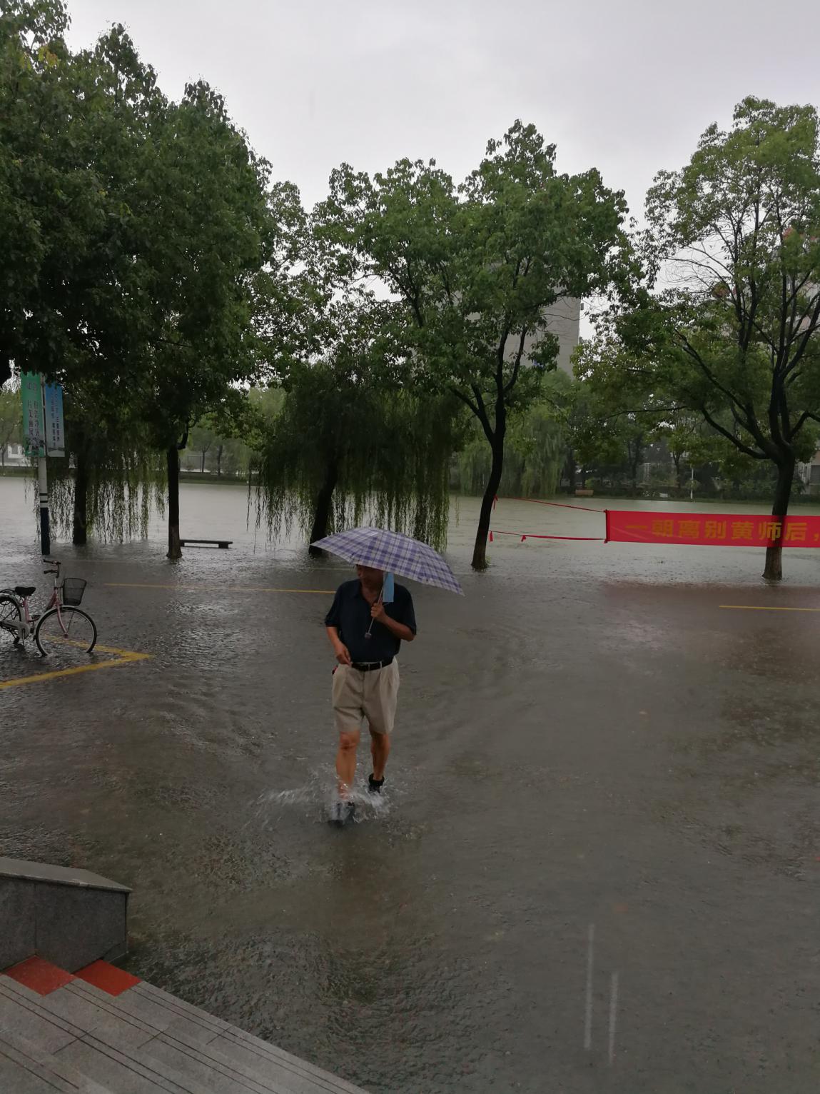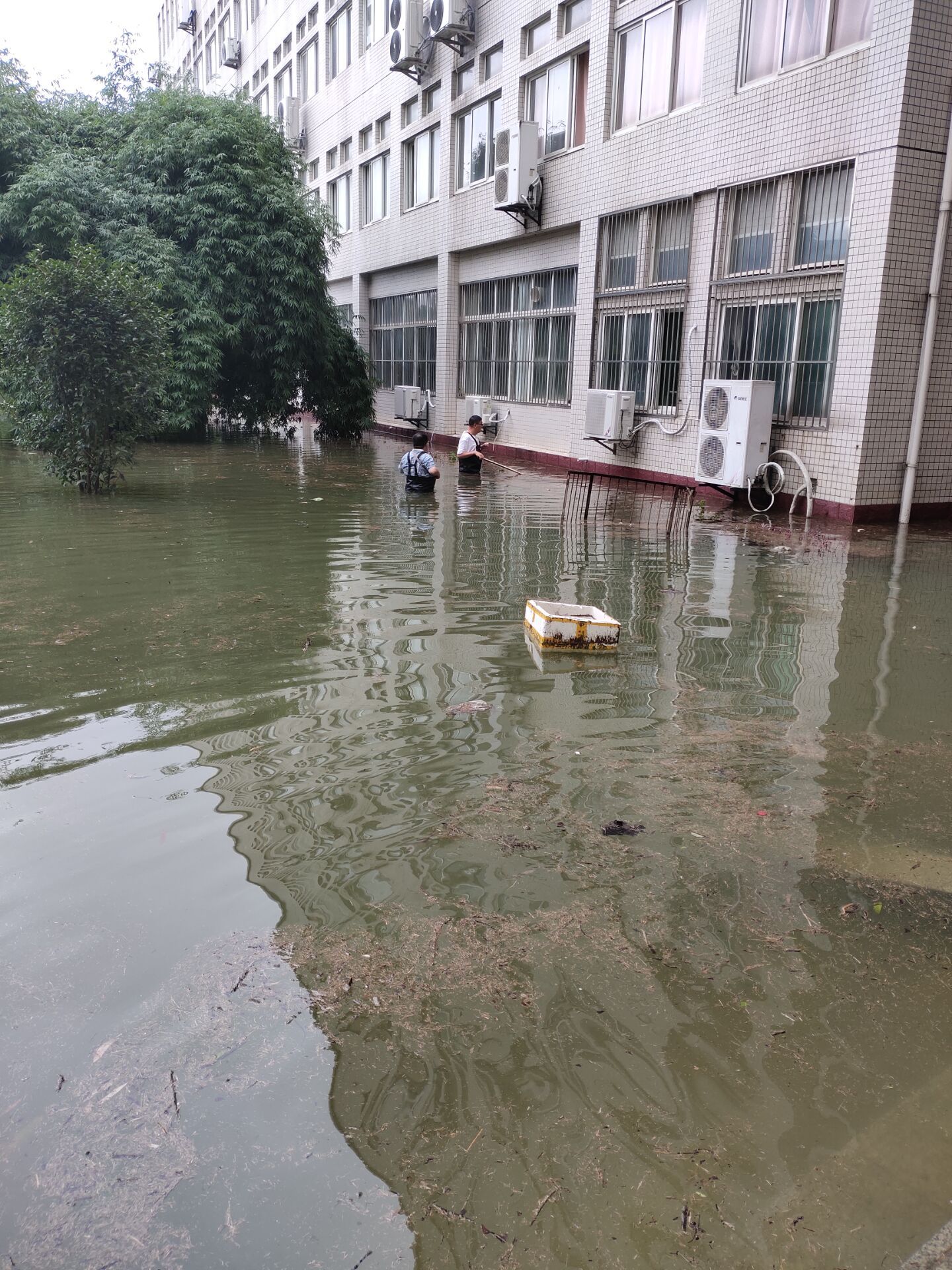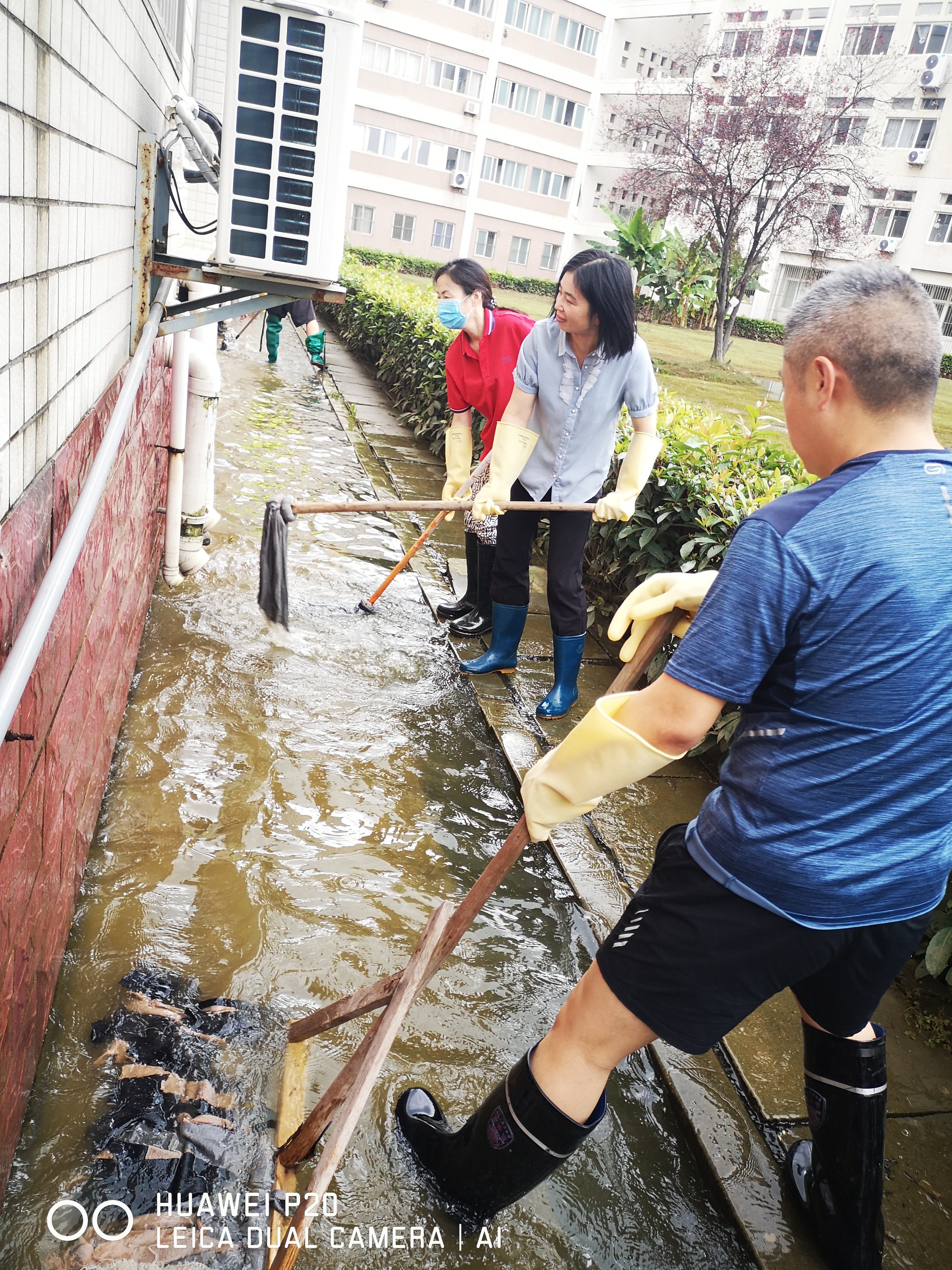 7月7日,滂沱大雨,下个不停,为了防止洪水从空调管口和下水管口倒灌,龙经理、张经理和门卫占师傅、陈建、解明江等青年教师穿着下水衣、拿着堵漏王,一个一个管口进行封堵,并请空调师傅将一楼所有空调外机上移抬高。