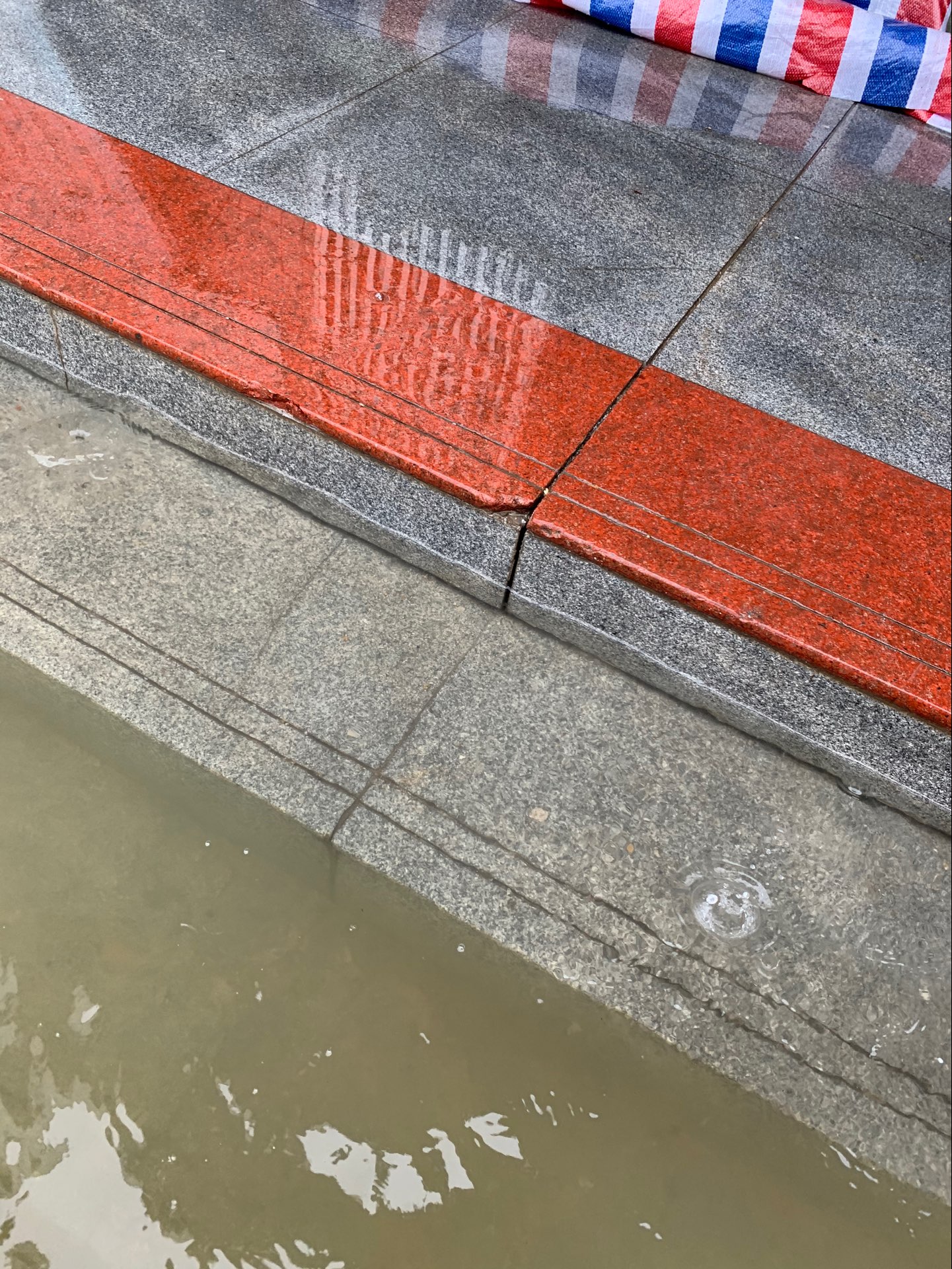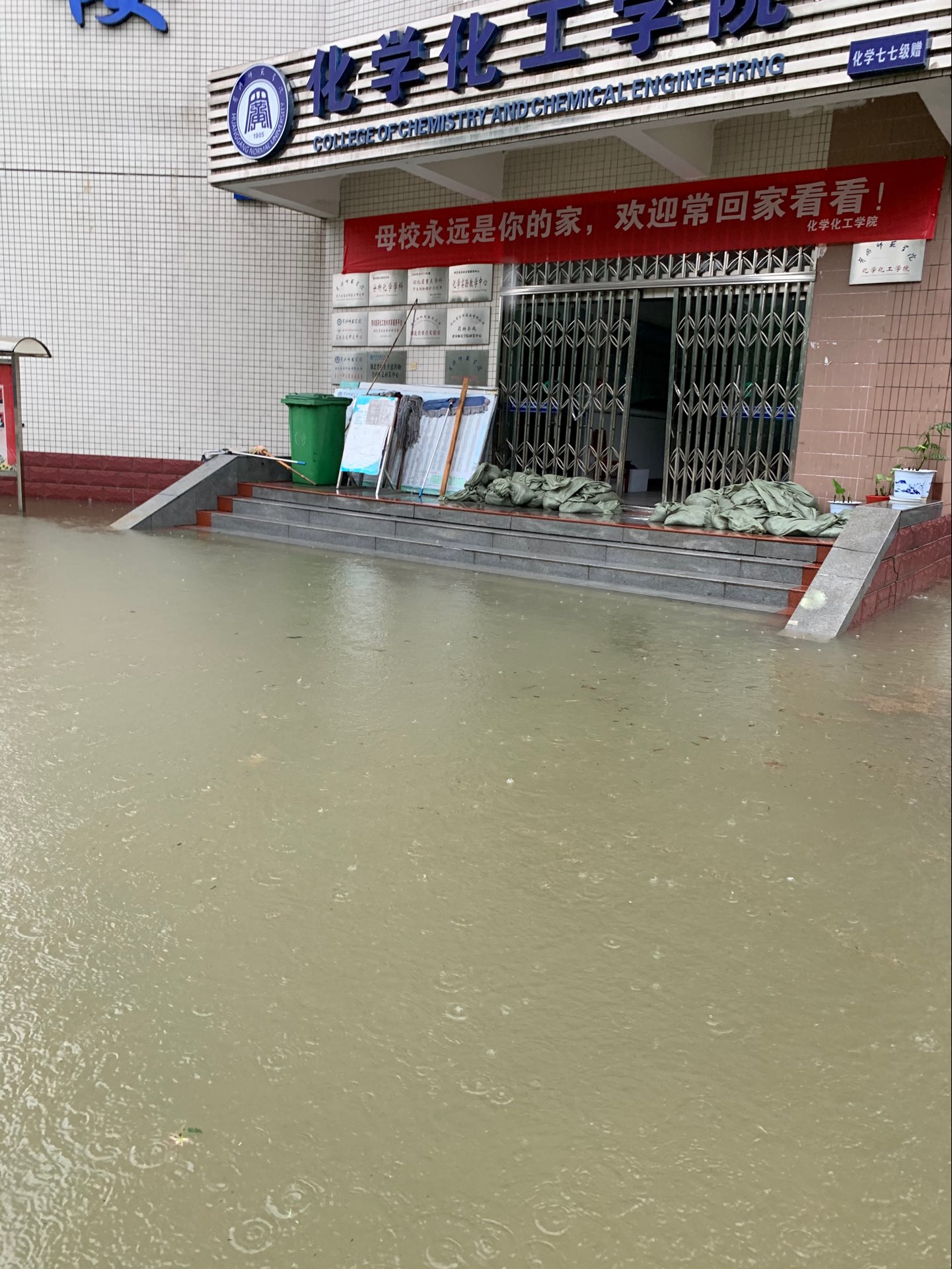 雨在哗啦啦的下,水位在嗖嗖的上升,水面已达一楼的第三个台阶, 担心晚上水面漫过所有台阶进入一楼。又接到学校通知市防汛指挥部有关专家预测,8日不下雨,长河全线水位上涨10公分左右,提醒公司南北校区一楼都要做好进水准备,请校内各单位迅速转移一楼重要物资和设备。南北校区水位达到了高压配电房的极限水位,市供电公司关掉了南区总电源。 一楼是我们刚建好的“化学分析测试中心”,集中了学院所有的高端精密仪器设备,一旦进水,损失惨重。晚上11点施书记指挥,龙涛经理带领叶辉丶阮志军丶肖延量和万柳等青年教师克服困境,不顾个人安危,深夜在伸手不见五指(全校停电)的深水中冒雨抢运沙袋到化学楼大门、新材料研究院门口筑堤拦水,张万举经理、龙涛经理和刘杰丶万柳等博士晚上在学院严防死守!确保化学楼一楼设备不受损失。