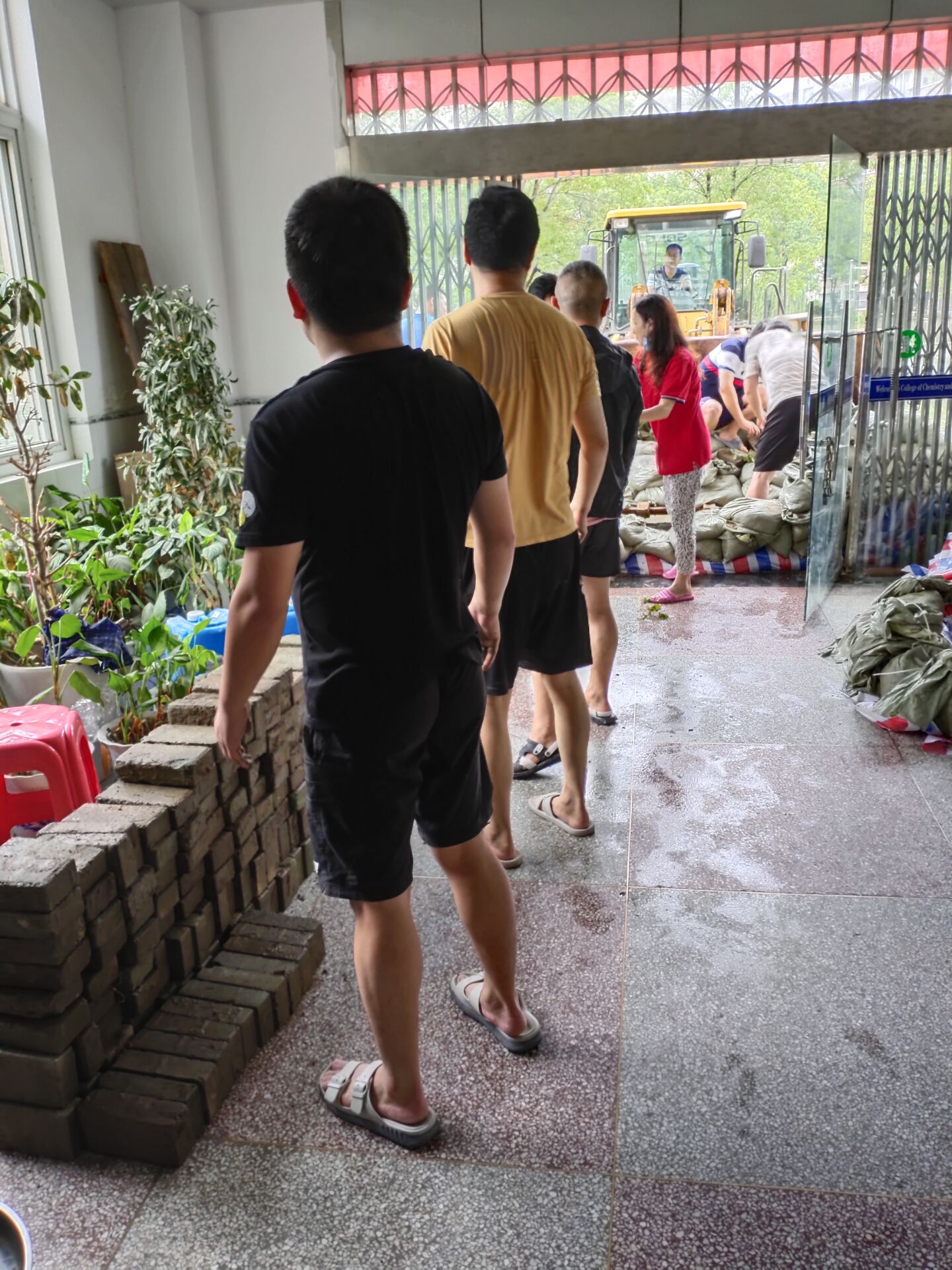 7月6日凌晨5:00龙经理放心不下赶到学校,发现情况危急,6:00打电话给施书记,龙经理电话说湖水快过路面,情况危急,施书记立马叫她儿子开车送到学校,到校时红烛湖水已漫过路面,汛情危急,施书记一声令下,通知全院教职员工火速赶到学校搬迁地下室的危化品,不到7:00,上至近60岁的杨水彬、廖学红、朱立红、郝卫东、莫小曼、潘俊雄、叶发兵等老教师下至刚入职的博士全都冒雨赶到学院,阮志军陈小利丶龙涛徐兰英丶陈建张燕等夫妇二人都参加了,陈砚美、余杨等老师把孩子一人留在家来抢险,何文涛不能来派高京来支援抢险,还有很多很多,男女老师不顾大雨淋湿衣服,早早赶到,迅速投入到危化品的搬迁抢险工作之中,大家齐上阵,不怕苦,不怕脏,不怕累,争先恐后,汗流浃背,一上午把所有的危化品从地下室搬上二楼。