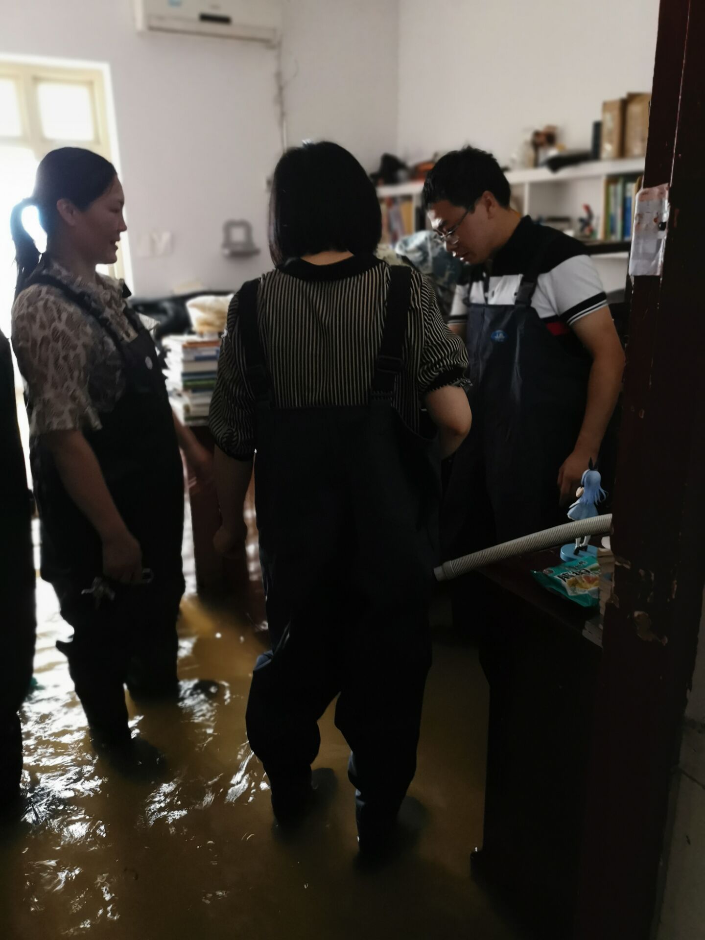 员工宿舍进水了,学院紧急组织班子成员和徐涛、林军奇等6名班主任老师对员工宿舍一楼的员工物品进行整理和抬高转移,在老师们的努力下,一楼员工的物品基本没有损失。