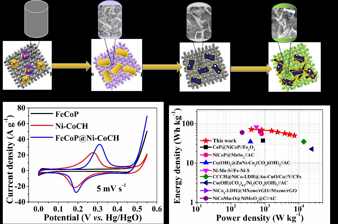 化工领域国际顶级期刊《Chemical Engineering Journal》(影响因子:10.652,SCI一区)近日在线发表bv伟德国际1946bv伟德国际1946“碳基能源材料学科团队”以“FeCoP nanosheets@Ni-Co carbonate hydroxide nanoneedles as free-standing electrode material for hybrid supercapacitors”为题最新研究成果(图1所示)。该工作实现了高容量和稳定循环柔性超级电容器的构建,为高性能非对称柔性超级电容器的设计和制造提供了新方案。公司为论文唯一通讯单位,bv伟德国际1946万柳博士为第一作者,解明江博士为共同通讯作者。