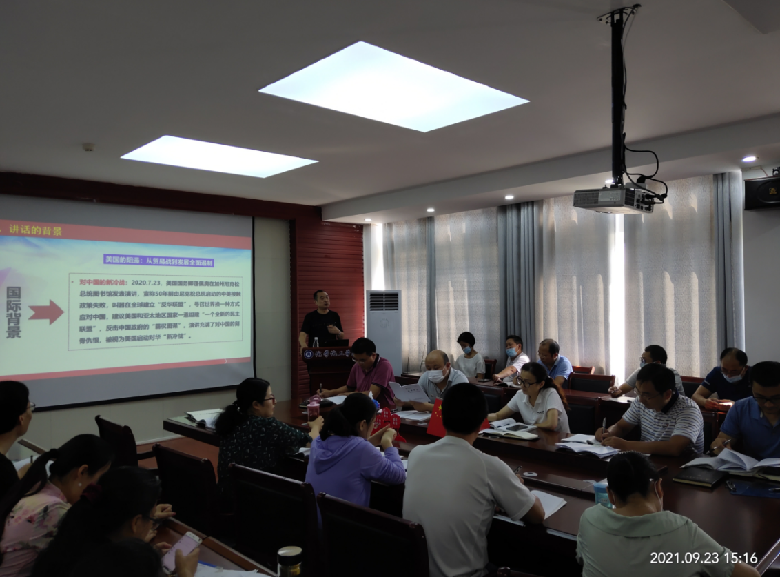黄冈师范公司党史学习教育理论专家宣讲团成员、马克思主义学院余维祥教授以《百年辉煌昭示民族复兴》为题做了专题宣讲。余教授从“七一”讲话的国际国内背景、“七一”讲话的框架结构、“七一”讲话提出的新思想、新观点、新要求和全面贯彻落实讲话精神四个方面进行辅导,“七一”讲话闪烁着马克思主义真理光芒,是新时代中国共产党人的政治宣言,是实现第二个百年奋斗目标的行动纲领。从党的百年奋斗历程,我们深深体会到了“中国共产党为什么能?中国特色社会主义为什么好?马克思主义为什么行?”大家纷纷表示要坚定听党话跟党走,全面贯彻落实讲话精神,为党育人,为国育才,为中华民族伟大复兴贡献力量!