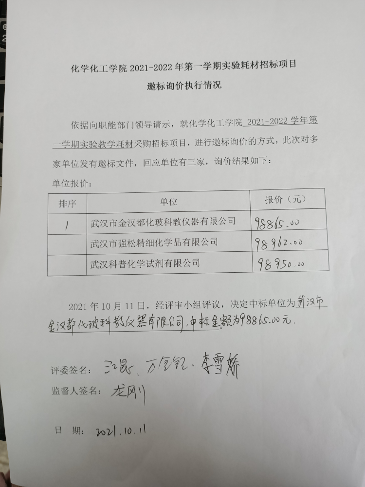 bv伟德国际19462021年秋季实验耗材的采购招标工作从2021年9月30日启动,公开面向社会招标,并在学院网上公示,截止到10月11日共收到有效标书3份,于10月11日学院组织人员开标 ,开标结果为 :武汉市金汉都化玻科教仪器有限公司以人民币98865.00元的价格中标。