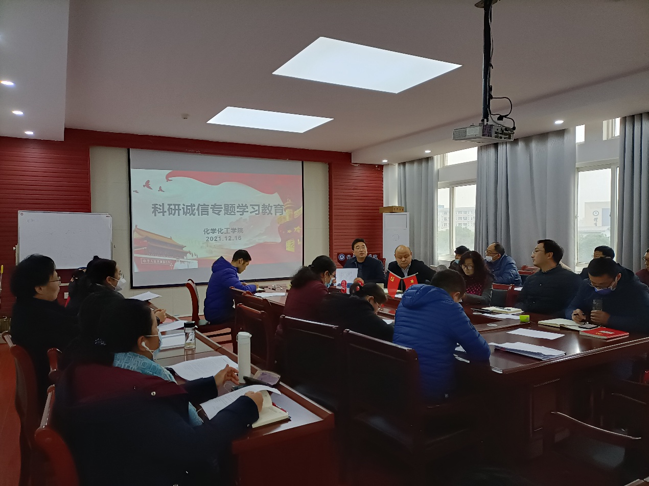 为培育和践行社会主义核心价值观,弘扬科学精神,倡导创新文化,营造诚实守信的良好科研环境,bv伟德国际1946于2021年12月16日下午在化学楼407会议室召开全体教职工大会,进行科研诚信专题学习教育,会议由分管科研的龙涛副经理主持。