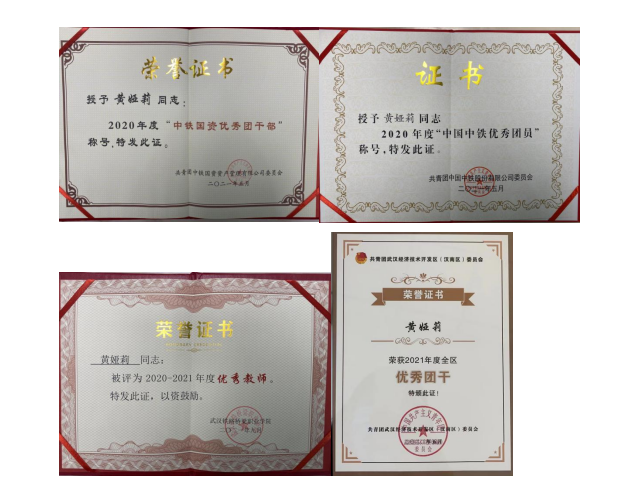 黄娅莉担任19级铁运4班班主任,班级学风良好,团结友爱。2019-2020学年度国家励志奖学金获得者5名。2021年4月获党史知识竞赛三等奖。2019年12月获“一二•九”爱国员工运动歌唱比赛三等奖。该同志积极组织班级开展了学习榜样表彰大会、文艺汇演、班干部述职大会、求职能力大赛等各项课余活动。