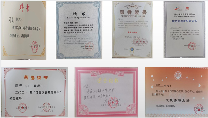 刘会在工作中脚踏实地,发掘工作中的不足,寻求解决思路,开拓创新,提升业务能力。她多次参与市级和区级等化学比武,向各学校优秀教师“取经”,解析自身在教学过程中存在的不足,并做到“三省吾身”,根据教学实践总结出自己的一套教学方法“严学风&细落实&宽生活”,并在带的三届员工中不断优化,取得了良好的教学成果。她始终坚持教学方法从员工中来,到员工中去,并在实践中做到“因材施教”。因此,在武汉市教学比武中获得二等奖,并获聘华中师范大学文学院实习指导老师。