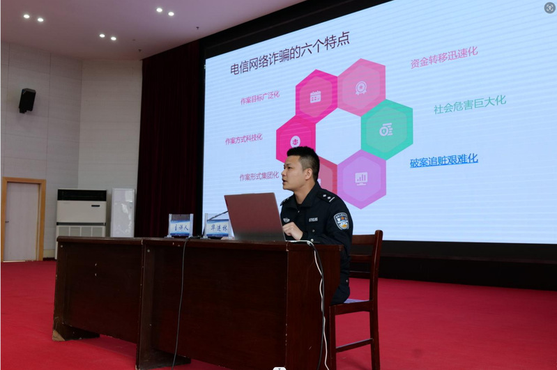 讲座中,华进林队长以“无诈校园、反诈有我”为主题,从电信网络诈骗的定义和特点、常见的诈骗手法及防范措施、谨防成为电信网络诈骗的帮凶三个方面详细宣讲。他指出,当前电信网络诈骗呈现作案目标广泛化、作案方式信息化、作案形式集团化、作案资金转移迅速化、作案社会危害巨大化、破案追赃艰难化的六大特点。并并结合本地典型案例以学校师生角度出发,介绍涉校电信网络诈骗的特征、惯用伎俩及识别新型电信网络诈骗的方法,还对在校师生容易被骗的原因进行了深入分析,并提供了行之有效的防范及补救建议,提醒大家切勿贪图小恩小惠,要提高自身防范意识,避免不必要的经济损失和防止违法犯罪。华进林队长以案示警、以案示法,在座师生全神贯注、仔细聆听,感觉深受教育。