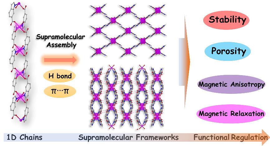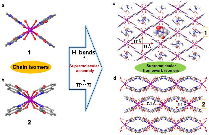 金属氢键有机框架材料(MetaloHydrogen-bonded organic frameworks, MHOFs)是一类新兴的多孔超分子框架材料,由含有金属的次级结构单元和有机配体通过氢键作用自主装构成,在质子超导、气体分离、荧光传感、分子磁性等领域具有广泛的应用前景。由于其具有较高的比表面积、多孔性、低密度和结构可调控等优势,兼备了金属有机骨架(MOFs)和共价有机骨架(COFs)两类多孔晶体材料的优点,近年来已引起院世界各地科学家们的广泛关注。公司邵东博士团队通过设计合成一种一维钴链,通过超分子弱作用和超分子异构现象,构筑了两种孔隙性、磁性、稳定性不同的超分子异构体MHOFs。这些发现不仅表明MHOF材料的结构和稳定性、孔隙度和磁性可以通过超分子异构化方法进行有效调节,还为磁性调控研究领城提供了新的方向和思路。