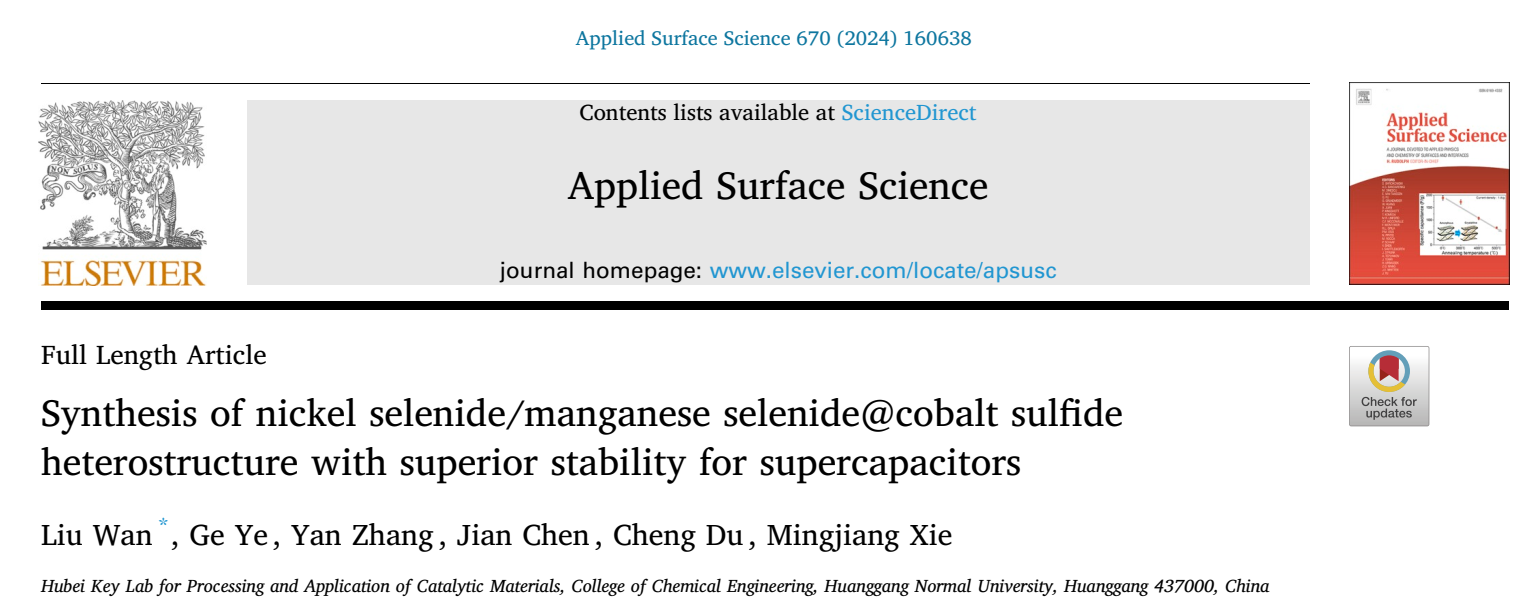 公司校级科研团队炭基能源材料团队,在期刊《Applied Surface Science》连续发表两篇最新研究成果“Synthesis of nickel selenide manganese selenide@cobalt sulfide heterostructure with superior stability for supercapacitors”和“Three-dimensional tree-like NiCo2Se4@ZnNi layered double hydroxide core-shell heterojunctions for supercapacitors”。bv伟德国际1946为论文唯一通讯单位,公司本科生叶格(化工2020级)、张燕博士、陈建博士、杜成博士和解明江教授参与了研究工作,万柳博士为论文第一作者。《Applied Surface Science》是由Elsevier集团出版的材料界面领域的国际重要学术刊物,位列中国科协高质量科技期刊分级目录中材料表面与界面领域的T1级,同时为SCI中科院分区TOP期刊。