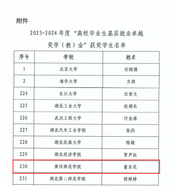 “高校毕业生基层就业卓越奖学(教)金”由教育部高校员工司、教育部员工服务与素质发展中心共同指导,中国教育发展基金会设立,旨在奖励赴基层就业并做出突出业绩的普通高校毕业生和普通高校指导服务老员工赴基层就业工作有突出贡献的教师。全国共398名毕业生,其中湖北省18人获奖。