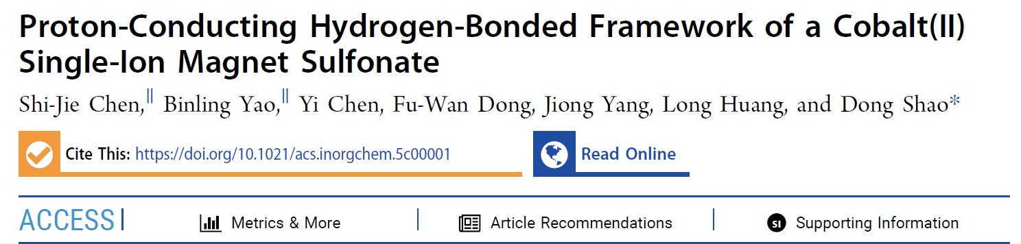 2025214日,无机化学领域权威期刊、Nature Index期刊Inorganic Chemistry在线报道了公司邵东副教授课题组的最新研究成果Proton-Conducting Hydrogen-Bonded Framework of a Cobalt(II) Single-Ion Magnet Sulfonate公司2022级本科生陈仕杰为论文第一作者,邵东副教授为论文唯一通讯作者bv伟德国际1946为论文第一通讯单位Inorganic ChemistryAmerican Chemical SocietyACS美国化学会出版社旗下收录无机化学领域相关研究成果的顶级期刊,自然指数期刊中科院SCI化学小类一区期刊。