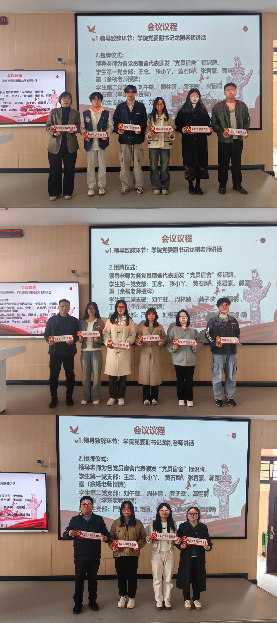 仪式现场,余杨、李东、龚文朋三位老师分别为三个党支部的党员寝室挂牌。崭新的标识牌让党员身份从隐形变为显形,时刻提醒党员同学以更高标准要求自己。员工党员们纷纷表示:挂牌让我感受到沉甸甸的责任,今后要以实际行动践行'向我看齐'的承诺。