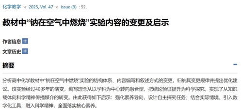 近日,公司青年教师周林楠博士在化学教育领域核心期刊《化学教学》上发表了教研论文1篇,题目为“教材中‘钠在空气中燃烧’实验内容的变更及启示”(化学教学,2025,47(9):92)。该文由周林楠博士担任第一作者,公司蒋小春副教授、田正芳教授参与了相关研究工作,华东师范大学附属东昌中学马善恒老师为通讯作者。这项研究得到湖北省教育厅基础教学研究项目基金的资助。