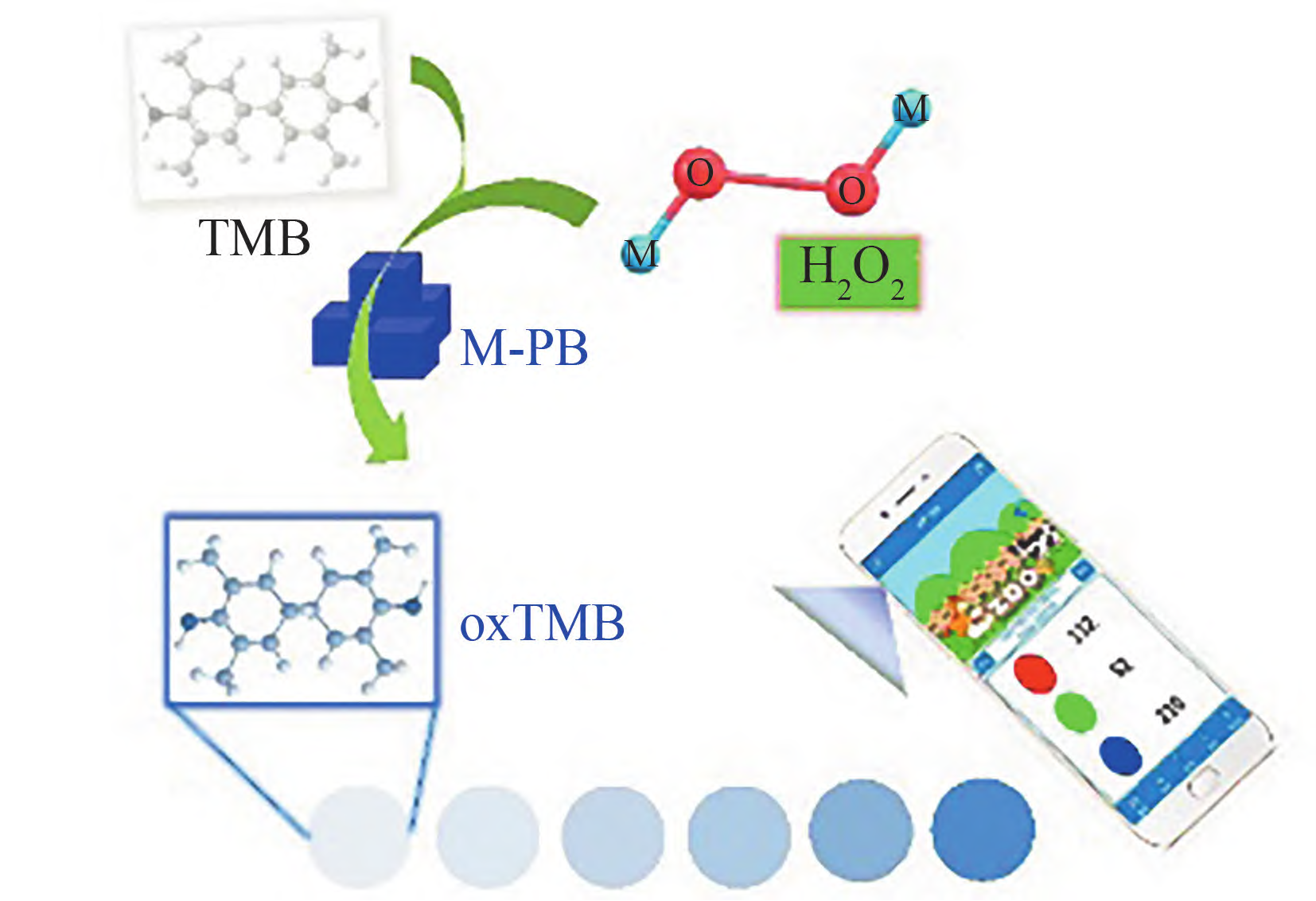 图2 基于金属掺杂普鲁士蓝纳米酶的比色传感平台用于检测过氧化氢。