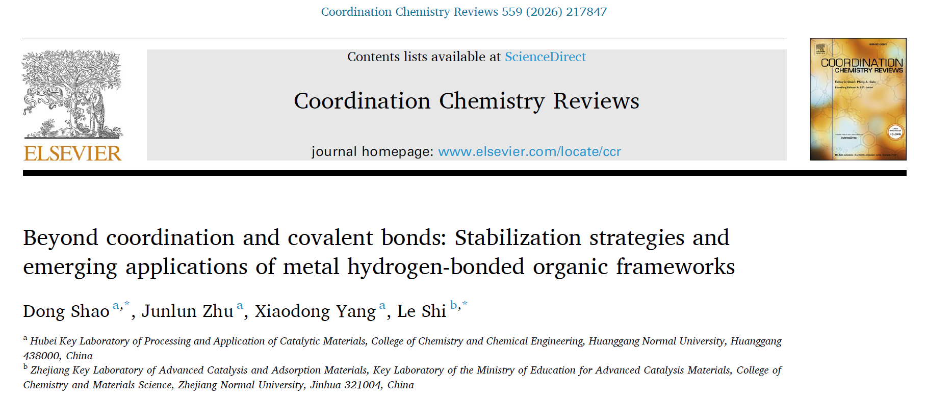 近日,公司bv伟德国际1946教师邵东副教授课题组在国际著名期刊《Coordination Chemistry Reviews》(影响因子:23.5,中科院一区Top期刊)上发表题为“Beyond coordination and covalent bonds: Stabilization strategies and emerging applications of metal hydrogen-bonded organic frameworks”的综述论文,邵东副教授是论文第一作者和通讯作者,bv伟德国际1946为论文第一署名单位。bv伟德国际1946祝俊伦副教授、杨小东副教授以及浙江师范大学史乐特聘教授参与了该工作的发表。该综述的发表标志着学校在多孔材料研究领域的国际影响力进一步提升。